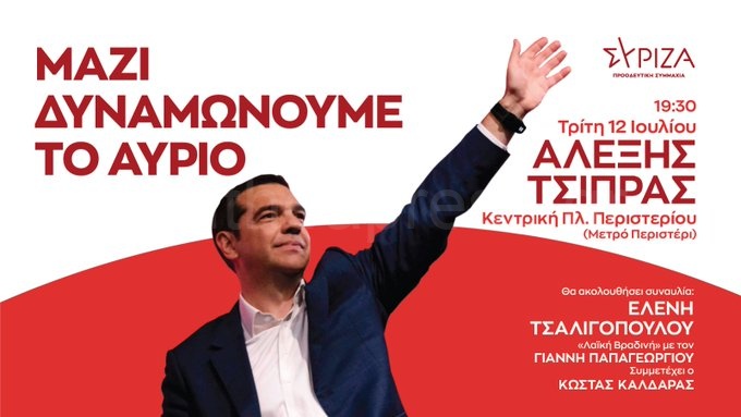 Ειδικότερα, ο επικεφαλής του ΣΥΡΙΖΑ Αλέξης Τσίπρας θα μιλήσει την Τρίτη 12/7 στις 19:30 στο Περιστέρι, και συγκεκριμένα στην κεντρική πλατεία της πόλης, στο Μετρό της πόλης.