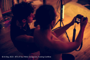 Στο post/production οπλίζεσαι με υπομονή, φτιάχνεις μια μεγάλη κανάτα με τσάι και γίνεσαι ένα με το υλικό που τράβηξες. Βλέπεις τα πλάνα ξανά και ξανά, τα κόβεις, τα ράβεις, τους βάζεις τσιρότα στα σημεία που έπεσαν άτσαλα και γρατζουνίστηκαν, τηλεφωνιέσαι απανωτά με άτομα για χρωματισμό, μουσική, σχεδιασμό και μίξη ήχου… και κάποια στιγμή η ταινία ολοκληρώνεται και ετοιμάζεται να βγει έξω, να γυρίσει τον κόσμο μέσω φεστιβάλ και να κάνει γνωριμίες. Η στιγμή που πρωτοβλέπεις μια ταινία σου στη μεγάλη οθόνη είναι μαγική. Όσες φορές και να την έχεις δει στο σπίτι σου, η ενέργεια του κοινού στην αίθουσα προβολής καθιστά τη θέαση μια μοναδική εμπειρία. Θα μπορούσα να εμβαθύνω πολύ περισσότερο αλλά θα καταλήγαμε σε διάλεξη αντί συνέντευξης. Περισσότερες πληροφορίες μετά την εγγραφή σας στην Ακαδημία Πορνό. Δεχόμαστε αιτήσεις με το λινκ που θα βρείτε στο προφίλ μας στο instagram https://www.instagram.com/fuckingconflicts/ ή μέσω της ιστοσελίδας athenspff.com.