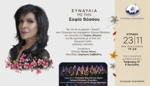 Ο Δήμος Παλαιού Φαλήρου συνεχίζει τις πολιτιστικές του δράσεις με μια ιδιαίτερη μουσική εκδήλωση που αναμένεται να προσελκύσει πλήθος πολιτών. Την Κυριακή 23 Νοεμβρίου, στον Πολυχώρο του Δημαρχείου, η πόλη υποδέχεται μία από τις πιο αγαπημένες και εμβληματικές φωνές του ελληνικού τραγουδιού, τη Σοφία Βόσσου. Η εκδήλωση θα ξεκινήσει στις 19:30 και εντάσσεται στο πλαίσιο του Χειμερινού Προγράμματος Τέχνης και Πολιτισμού του Δήμου, το οποίο κάθε χρόνο παρουσιάζει μία σειρά δράσεων που απευθύνονται τόσο σε ενήλικους όσο και σε παιδιά.