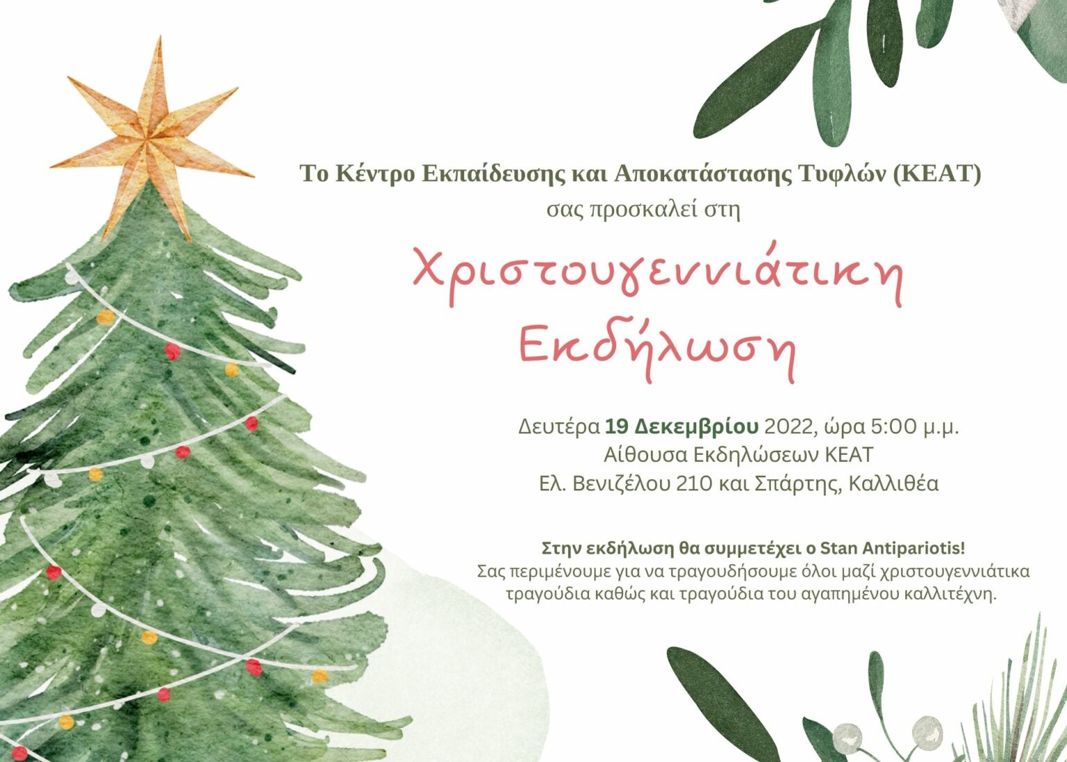 Το κέντρο Εκπαίδευσης και Αποκατάστασης Τυφλών (ΚΕΑΤ) μας προσκαλεί την ερχόμενη τη Δευτέρα 19 Δεκεμβρίου και ώρα 5.00 μ.μ. να τραγουδήσουμε και να υποδεχτούμε το πνεύμα των Χριστουγέννων μαζί με τον Stan Antipariotis.