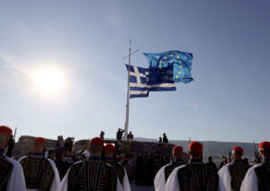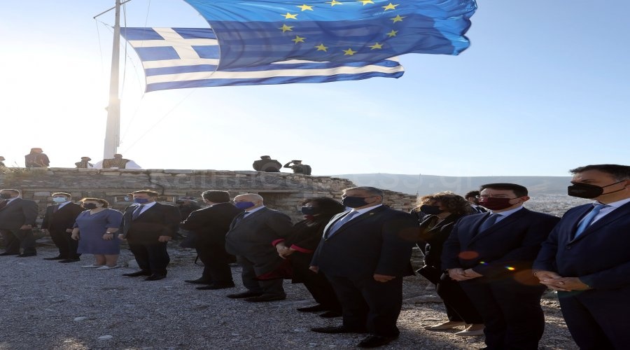 Στη σεμνή, αλλά εξόχως συμβολική τελετή, η Πρόεδρος της Δημοκρατίας και ο Αντιπρόεδρος της Ευρωπαϊκής Επιτροπής Μ. Σχοινάς παρέστησαν στην ταυτόχρονη έπαρση των δύο σημαιών υπό τον εθνικό ύμνο της Ελλάδας και τον ύμνο της Ε.Ε.
