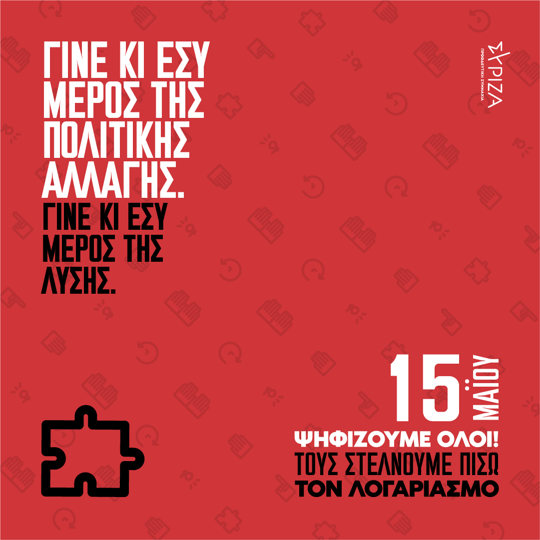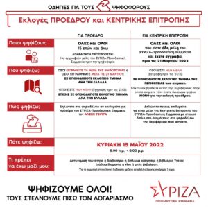 Την Κυριακή 15 Μαΐου μπορούν όλοι οι πολίτες να ψηφίσουν στις εκλογές για Πρόεδρο του ΣΥΡΙΖΑ-Προοδευτική Συμμαχία και να στείλουν μαζικό μήνυμα για την πολιτική αλλαγή” αναφέρει η σχετική ανακοίνωση του ΣΥΡΙΖΑ.