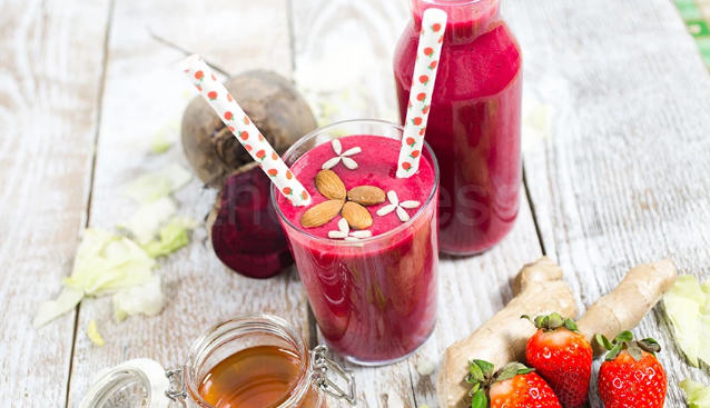 Τοποθετήστε τις φράουλες, το μαρούλι, το παντζάρι και το τζίντζερ στο μπλέντερ ή σε έναν επεξεργαστή τροφίμων και χτυπήστε μέχρι να ομογενοποιηθεί το μείγμα.