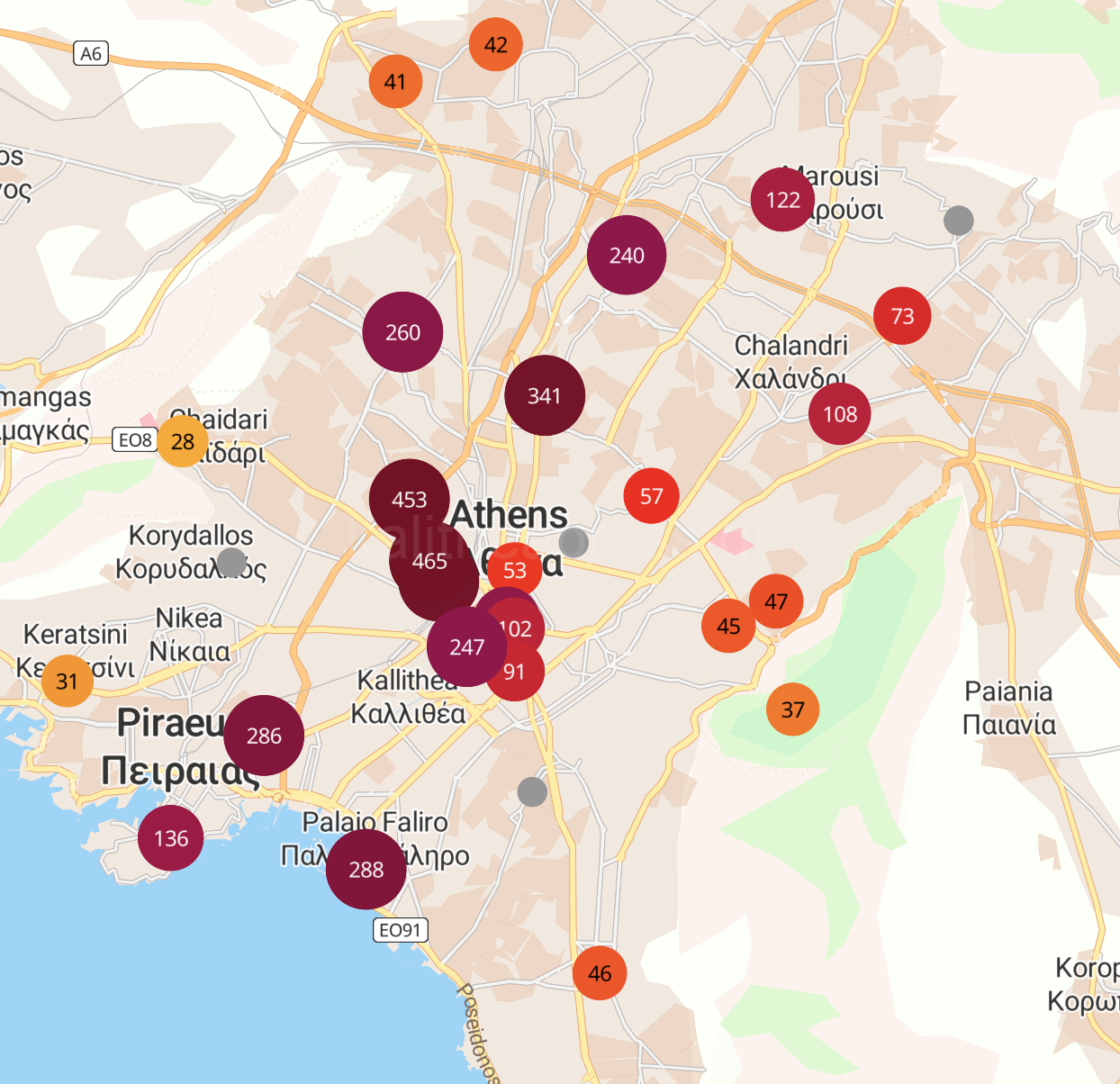 Τα επιβλαβή σωματίδια PM2.5 (λεπτά εισπνεόμενα σωματίδια, με διάμετρο περί τα 2,5 μικρόμετρα και μικρότερα) έχουν φτάσει σε επικίνδυνες τιμές στην ατμόσφαιρα σε πολλές περιοχές της Αθήνας, σύμφωνα με ανακοίνωση του Εθνικού Αστεροσκοπείου Αθηνών. Οι μονάδες είναι σε μικρογραμμάρια ανά κυβικό μέτρο.