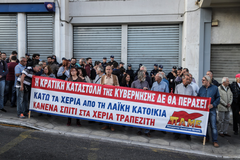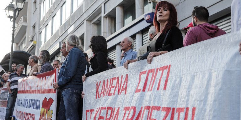 Κρατώντας πανό και φωνάζοντας συνθήματα, «Κανένα σπίτι σε χέρια τραπεζίτη» οι συγκεντρωμένοι, διαμαρτύρονται για πλειστηριασμό πρώτης κατοικίας.