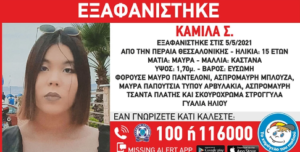 Στις 5/5/2021 στις 20:00, εξαφανίστηκε από το σπίτι της, η Καμίλα Σ., 15 ετών, με καταγωγή από το Καζακστάν. Η Καμίλα Σ. έχει ύψος 1.70 μ., είναι εύσωμη, έχει καστανά μαλλιά (κοντά και ξυρισμένα στο πλάι) και μαύρα μάτια. Φορούσε μαύρο παντελόνι, ασπρόμαυρη μπλούζα, μαύρα παπούτσια τύπου αρβυλάκια και είχε μαζί της ασπρόμαυρη τσάντα πλάτης και σκούρα στρόγγυλα γυαλιά ηλίου.