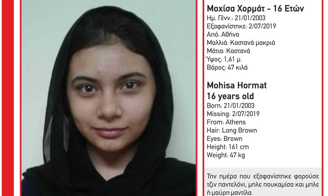 Πρόκειται για την Αφγανή Μοχίσα Χορμάτ η οποία αγνοείται από τις 2 Ιουλίου, και γίνεται έκκληση προς όποιον ξέρει κάτι να επικοινωνήσει με την αστυνομία ή με το «Χαμόγελο του Παιδιού» οποιαδήποτε ώρα.