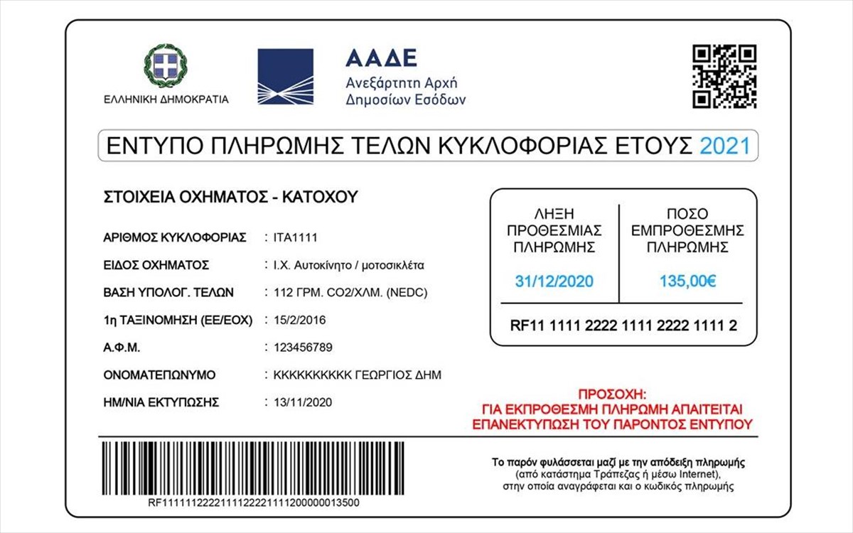 Αναρτήθηκαν στο Taxisnet τα ειδοποιητήρια για τα Τέλη Κυκλοφορίας 2021. Σύμφωνα με την ΑΑΔΕ, το φετινό ειδοποιητήριο περιλαμβάνει και έναν QR Code. Συγκεκριμένα, σκανάροντας τον κωδικό αυτό, οι φορολογούμενοι μπορούν να πληρώνουν εύκολα τα τέλη τους, μέσω mobile banking, χωρίς να γράφουν τον κωδικό πληρωμής και το ποσό. Η ΑΑΔΕ συνιστά στους υπόχρεους να ακολουθούν τη συγκεκριμένη διαδικασία, αποφεύγοντας την επίσκεψη στα υποκαταστήματα των τραπεζών και των Ελληνικών Ταχυδρομείων.