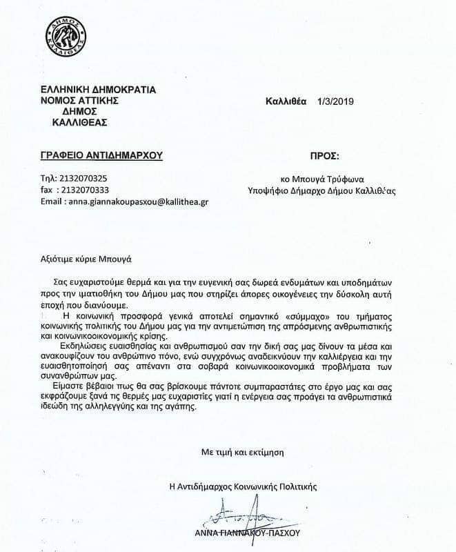 Σήμερα είχαμε τη χαρά να λάβουμε την ευχαριστήρια επιστολή της κυρίας Άννας Γιαννάκου – Πάσχου, Αντιδημάρχου Κοινωνικής Πολιτικής, για την εθελοντική προσφορά ιματισμού που κάναμε για να στηρίξουμε τους συνανθρώπους μας που έχουν βρεθεί σε δεινή οικονομική κατάσταση από την κρίση των ημερών μας.