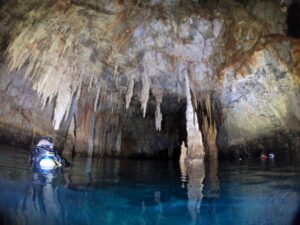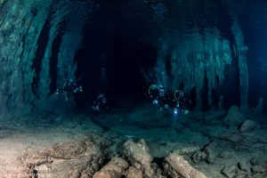 Στην είσοδο του σπηλαίου υπάρχει ένα τούνελ περίπου 40 μέτρων και στη συνέχεια το υπόλοιπο τμήμα έχει μήκος 125 μέτρα και μέσο πλάτος τα 25 μέτρα το οποίο αποτελεί και την κύρια αίθουσα του σπηλαίου, η οποία έχει εν μέρει κατακλυστεί από ύδατα. Πρίν το τέλος της διαδρομής ο δύτης εισέρχεται σε ένα άλλο τοπίο. Η ολόλευκη άμμο διαφοροποιεί τις χρωματικές αποχρώσεις κάνοντας την εικόνα εξωπραγματική.