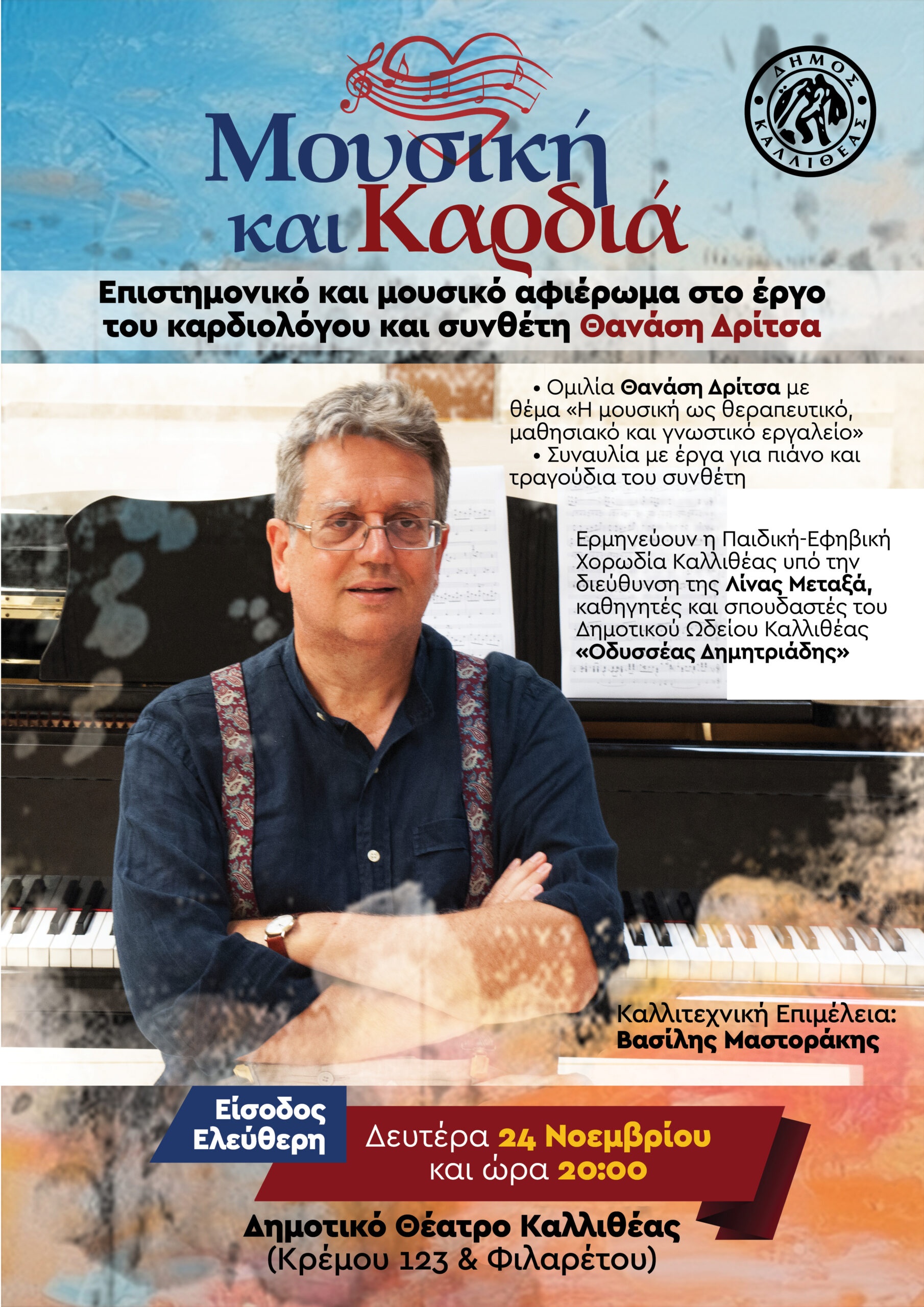 Ο Δήμος Καλλιθέας, σε συνεργασία με το Ωνάσειο Νοσοκομείο και το Δημοτικό Ωδείο Καλλιθέας «Οδυσσέας Δημητριάδης», διοργανώνει τη Δευτέρα 24 Νοεμβρίου, στις 8 μ.μ., στο Δημοτικό Θέατρο Καλλιθέας (Κρέμου και Φιλαρέτου), ένα μοναδικό επιστημονικό και μουσικό αφιέρωμα στον καρδιολόγο, συνθέτη και συγγραφέα Θανάση Δρίτσα. Η είσοδος για το κοινό είναι ελεύθερη.