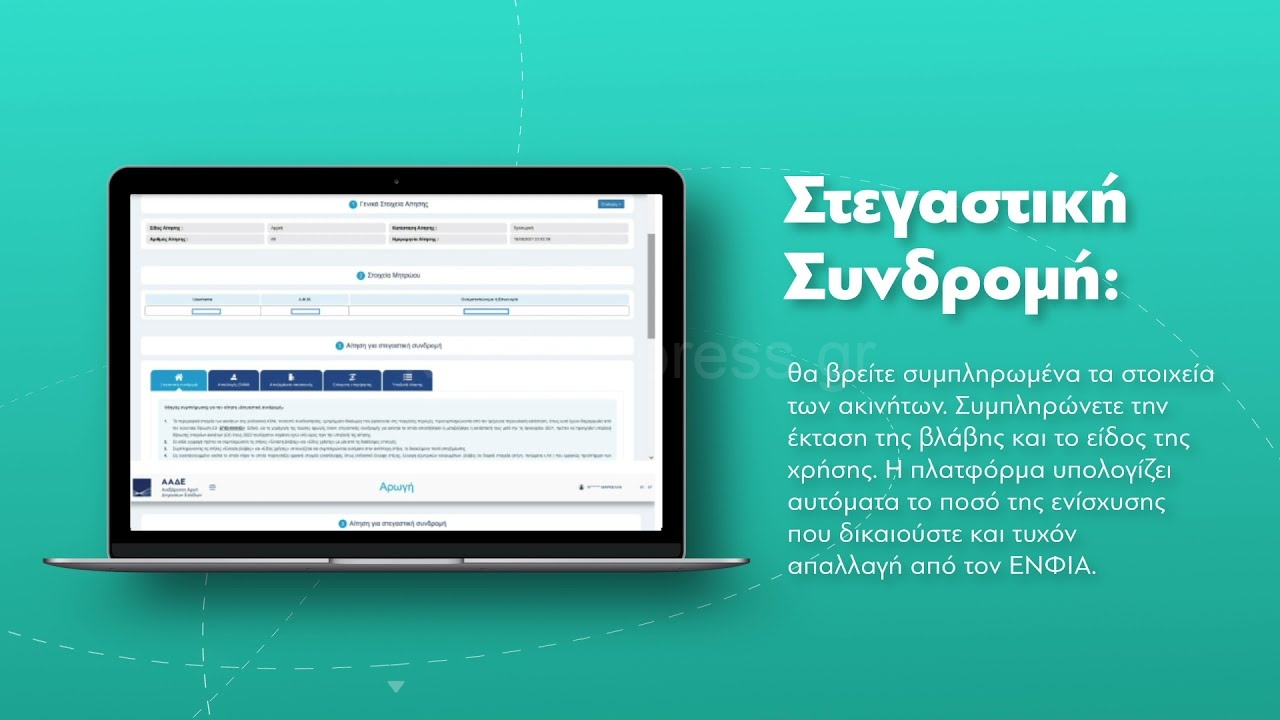 - να υποβάλουν αίτηση και νοικοκυριά, επιχειρήσεις και ιδιοκτήτες ακινήτων που επλήγησαν από τις πυρκαγιές που εκδηλώθηκαν σε περιοχές της χώρας από 1η Μαΐου ως και 2 Σεπτεμβρίου 2021, τόσο για τη χορήγηση πρώτης αρωγής έναντι στεγαστικής συνδρομής, έναντι επιχορήγησης και αποζημίωσης οικοσκευής, όσο και για απαλλαγή από τον ΕΝΦΙΑ,