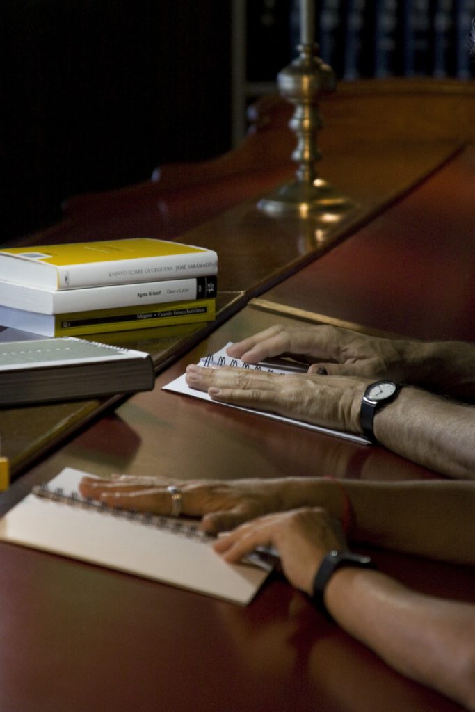 Στα αναγνωστήρια στον δεύτερο όροφο της Εθνικής Βιβλιοθήκης της Ελλάδος, δύο συμμετέχοντες, καθισμένοι ο ένας δίπλα στον άλλο σε ένα τραπέζι, φορούν ακουστικά και έχουν μπροστά τους ένα κόκκινο και ένα κίτρινο τετράδιο και μερικούς τόμους βιβλίων. Καθώς λαμβάνουν στα ακουστικά τους οδηγίες ψιθυριστά, διαβάζουν σιωπηλά αποσπάσματα από τη μικρή στοίβα των βιβλίων τους.