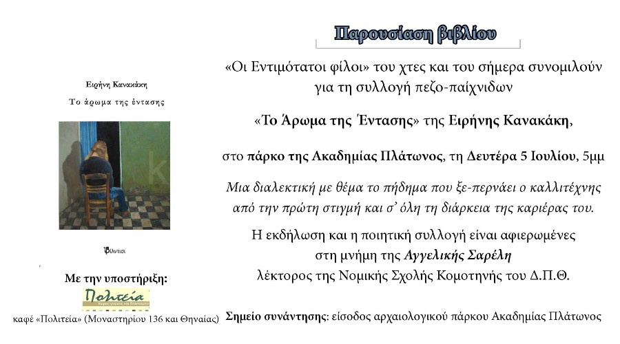 «Το Άρωμα της Έντασης» της Ειρήνης Κανακάκη, στο πάρκο της Ακαδημίας Πλάτωνος, τη Δευτέρα 5 Ιουλίου, 5μμ