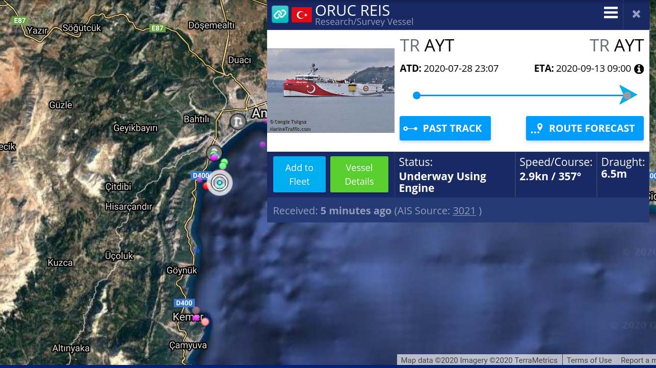 Έφτασε στην Αττάλεια το Oruc Reis, μετά και τη μη ανανέωση της τουρκικής Navtex που έληγε χθες Κυριακή 12 Σεπτεμβρίου. Σύμφωνα με τον θαλάσσιο χάρτη πλοίων του MarineTraffic, το τουρκικό ερευνητικό σκάφος βρίσκεται στο εσωτερικό του λιμανιού.
