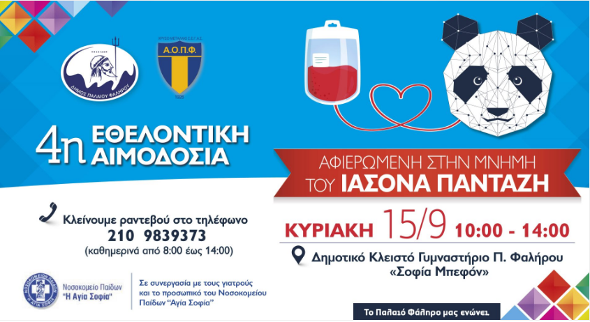 Εθελοντική Aιμοδοσία, εις μνήμη Ιάσoνα Πανταζή, με αφορμή την συμπλήρωση 6 χρόνων από την τραγική απώλεια του ταλαντούχου Φαληριώτη αθλητή της υδατοσφαίρισης και του Α.Ο.Π.Φ., σε τροχαίο δυστύχημα, διοργανώνουν η οικογένειά του, με τον Δήμο Παλαιού Φαλήρου και το φιλικό περιβάλλον του.