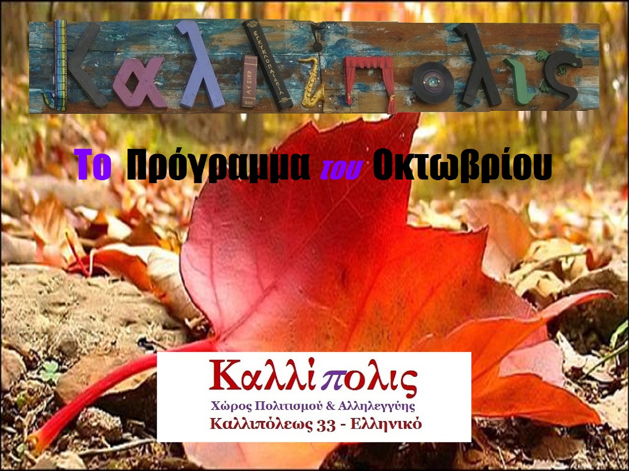 Τέσσερα μουσικά events, σεμινάρια – μαθήματα, κινηματογράφος και παρουσίαση βιβλίου χαρακτηρίζουν τον Οκτώβριο σύμφωνα με το πλούσιο πρόγραμμα που έδωσε στη δημοσιότητα ο Χώρος Πολιτισμού & Αλληλεγγύης «Καλλίπολις», μετά τη σύσκεψη μελών & φίλων που πραγματοποιήθηκε την Τετάρτη 25/9.