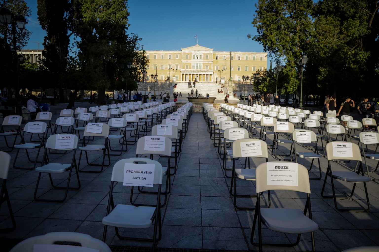 Στην πλατεία Συντάγματος, οι άδειες καρέκλες είχαν ταμπέλες με διάφορα αιτήματα, όπως «επιδότηση ενοικίου στο 100%» και η «μείωση ΦΠΑ στο 6%». Να σημειωθεί ότι κάτι αντίστοιχο έγινε και σε άλλες χώρες της Ευρώπης.