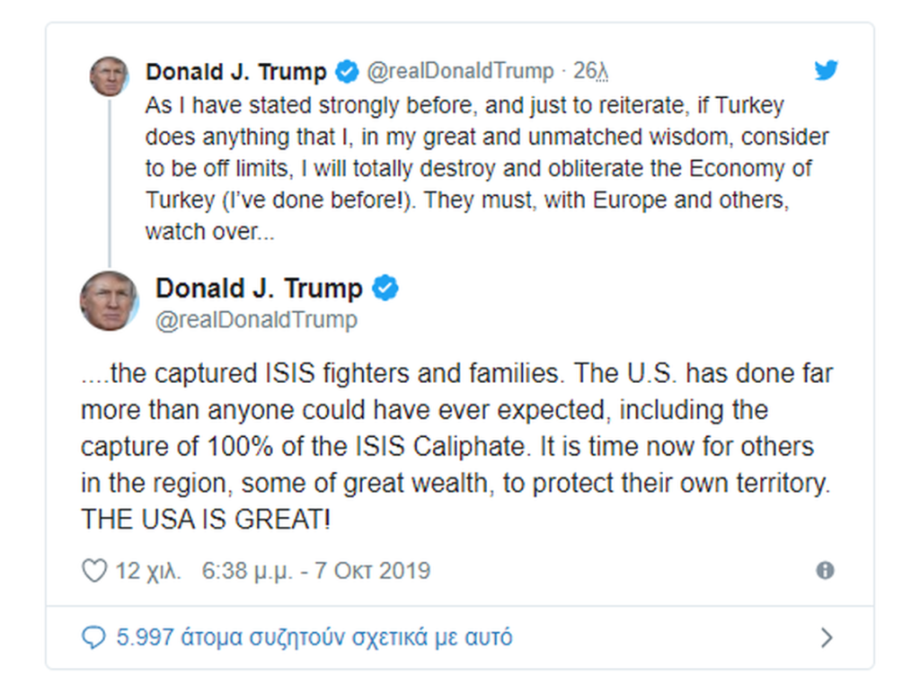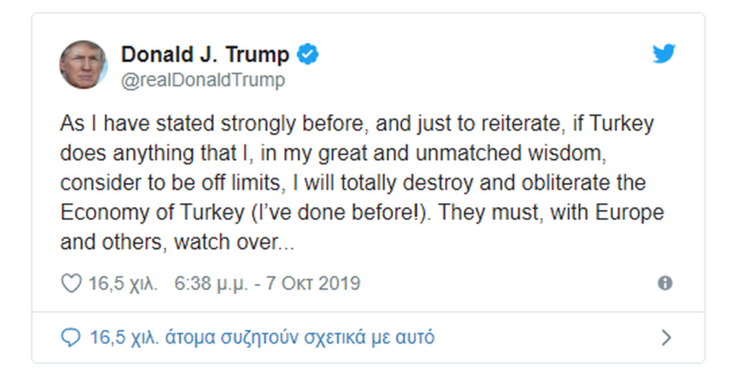 «Οι ατελείωτοι, γελοίοι πόλεμοι έχουν τελειώσει. Επικεντρωνόμαστε στη μεγάλη εικόνα γνωρίζοντας ότι μπορούμε πάντα να πάμε πίσω και να τους διαλύσουμε. Όπως έχω δηλώσει και στο παρελθόν, εάν η Τουρκία κάνει κάτι που εγώ, με τη μεγάλη και ασύγκριτη σοφία μου, θεωρήσω ότι είναι εκτός ορίων, θα καταστρέψω ολοσχερώς και θα εξαλείψω την οικονομία της Τουρκίας», έγραψε ο Ντόναλντ Τραμπ.