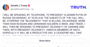 Ο Τραμπ δήλωσε ότι η συζήτησή του με τον Πούτιν θα επικεντρωθεί στο να σταματήσει το «λουτρό αίματος» του πολέμου.