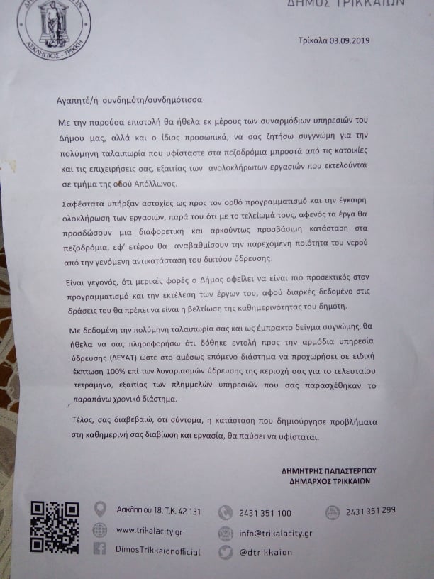 Δημόσια συγνώμη ζήτησε ο δήμαρχος Τρικκαίων Δημήτρης Παπαστεργίου για την ταλαιπωρία που υπέστησαν οι κάτοικοι μιας συγκεκριμένης οδού στα Τρίκαλα, προχωρώντας σε μια πρωτοφανής κίνηση. Ανακοίνωσε πως δεν θα πληρώσουν νερό για 4 μήνες.