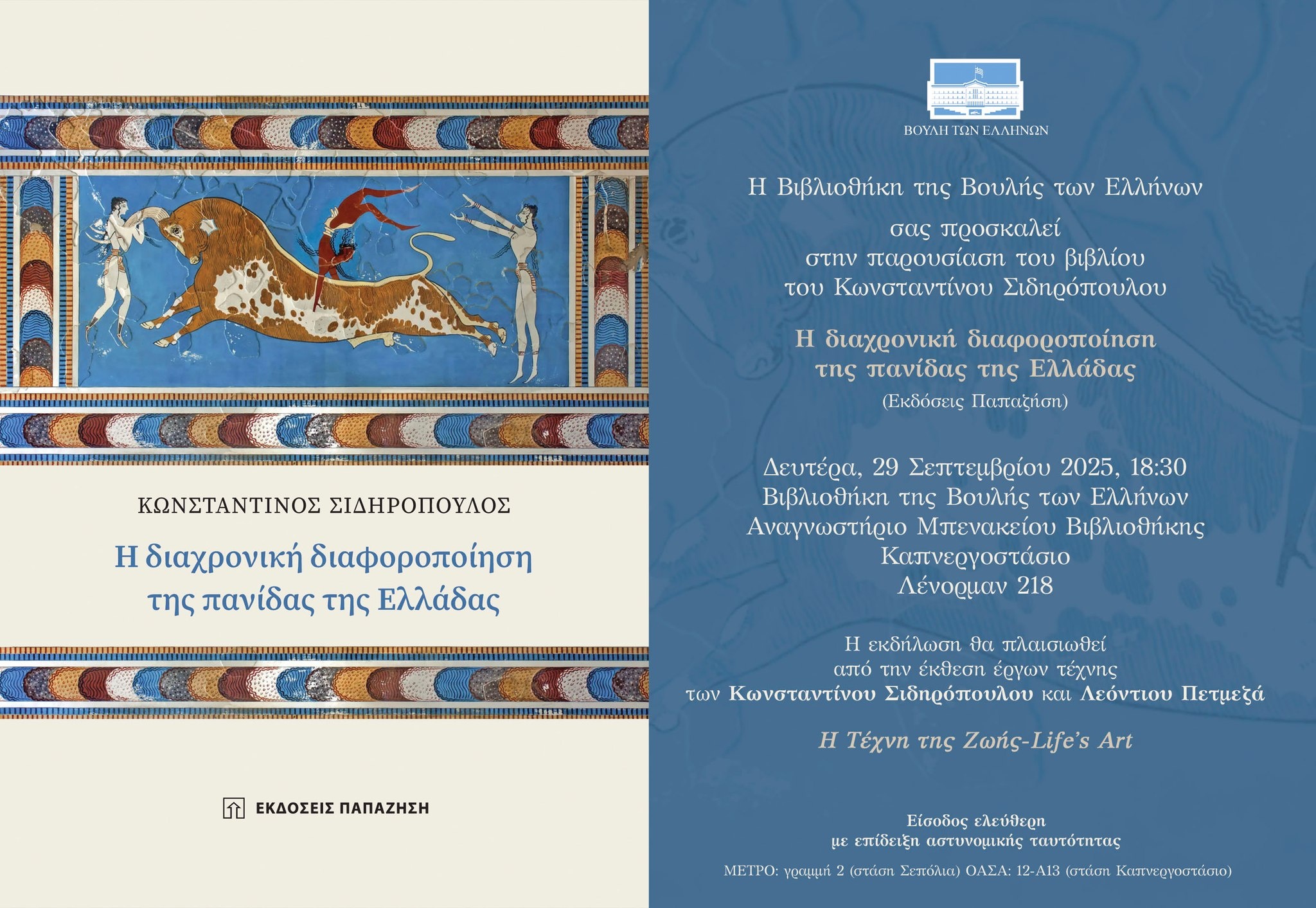 Την Δευτέρα 29 Σεπτεμβρίου 2025 και για ένα μήνα θα έχει διάρκεια η έκθεση-εικαστικός διάλογος που θα πραγματοποιήσω με τον Διδάκτορα Βιολογίας ,συγγραφέα ,εικαστικό Κωνσταντίνο Σιδηρόπουλο με τίτλο ”Η τέχνη της ζωής -Life ‘s art” στον εκθεσιακό χώρο της Βιβλιοθήκης της Βουλής των Ελλήνων, Καπνεργοστάσιο, Λένορμαν 218. Η εικαστική συνύπαρξη μας θα πλαισιώσει την παρουσίαση του νέου βιβλίου του Κωνσταντίνου Σιδηρόπουλου: Η διαχρονική διαφοροποίηση της πανίδας της Ελλάδας των, εκδόσεων Παπαζήσης που θα γίνει την Δευτέρα 29 Σεπτεμβρίου 2025 στο Αναγνωστήριο της Μπενακείου Βιβλιοθήκης από τους καθηγητές του τμήματος Βιολογίας ΕΚΠΑ Ευστράτιο Βαλάκο και Παναγιώτη Παφίλη και τον Κωνσταντίνο Σιδηρόπουλο. Χαιρετισμό θα απευθύνει η Όλγα Γεροβασίλη,1η Αντιπρόεδρος της Βουλής των Ελλήνων.