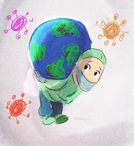 (σκιτσο της Βιβής Μαρκάτου για τον ιό)