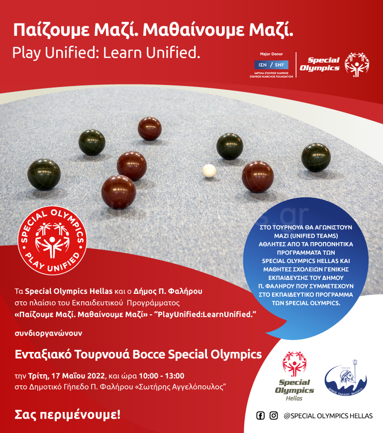 Τα Special Olympics Hellas και ο Δήμος Παλαιού Φαλήρου, συνεχίζοντας την εποικοδομητική συνεργασία που έχουν τα τελευταία χρόνια, στο πλαίσιο του Εκπαιδευτικού Προγράμματος: «Παίζουμε Μαζί. Μαθαίνουμε Μαζί.» – “Play Unified: Learn Unified.”, συνδιοργανώνουν το «Ενταξιακό Τουρνουά Bocce Special Olympics»