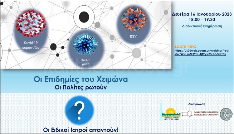 Διαδικτυακή Ημερίδα την Δευτέρα 16 Ιανουαρίου 2023 και ώρα 18:00 – 19:30 στα πλαίσια της Καμπάνιας Ενημέρωσης του Ελληνικού Διαδημοτικού Δικτύου Υγιών Πόλεων του Π.Ο.Υ. με τίτλο: “Οι Επιδημίες του Χειμώνα, – Οι Πολίτες ρωτούν, οι Ειδικοί Ιατροί απαντούν”, η οποία πραγματοποιείται με τη συνεργασία της Ελληνικής Εταιρείας Χημειοθεραπείας και τον Ιατρικό Σύλλογο Αθηνών. Η εκδήλωση έχει στόχο την ορθή ενημέρωση για την αντιμετώπιση των επιδημιών του χειμώνα, όπως ιώσεις, γρίπη καθώς και έναντι της πανδημίας covid-19, που ταλαιπωρούν τόσο τους ενήλικες όσο και τα παιδιά. Μέσα από προσεκτικά επιλεγμένες ερωτήσεις οι ειδικοί ιατροί καλούνται να καλύψουν απορίες των πολιτών σχετικά με το θέμα. Στο πάνελ θα συμμετάσχουν 4 ιατροί μέλη της Εταιρείας Χημειοθεραπείας, ενώ τη συζήτηση θα συντονίζει η δημοσιογράφος κα Ελένη Καμάρα, η οποία θα απευθύνει και τις ερωτήσεις στους ιατρούς. Επιπλέον, όσοι πολίτες συμμετάσχουν στην εκδήλωση θα έχουν τη δυνατότητα να απευθύνουν επιπλέον ερωτήσεις, σχετικές με το θέμα