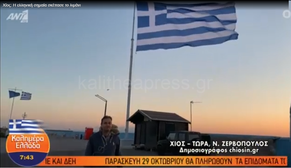 Μια τεράστια ελληνική σημαία “σκεπάζει” το λιμάνι της Χίου, για τη σημερινή, 81η επέτειο της 28ης Οκτωβρίου 1940. Σε ζωντανή σύνδεση ο δημοσιογράφος της Chiosin.gr Νίκος Ζερβόπουλος παρά τον δυνατό αέρα συνομίλησε με τον Γιώργο Παπαδάκη με φόντο την Ελληνική σημαία των 100 τμ που έχει στηθεί στο λιμάνι της Χίου.