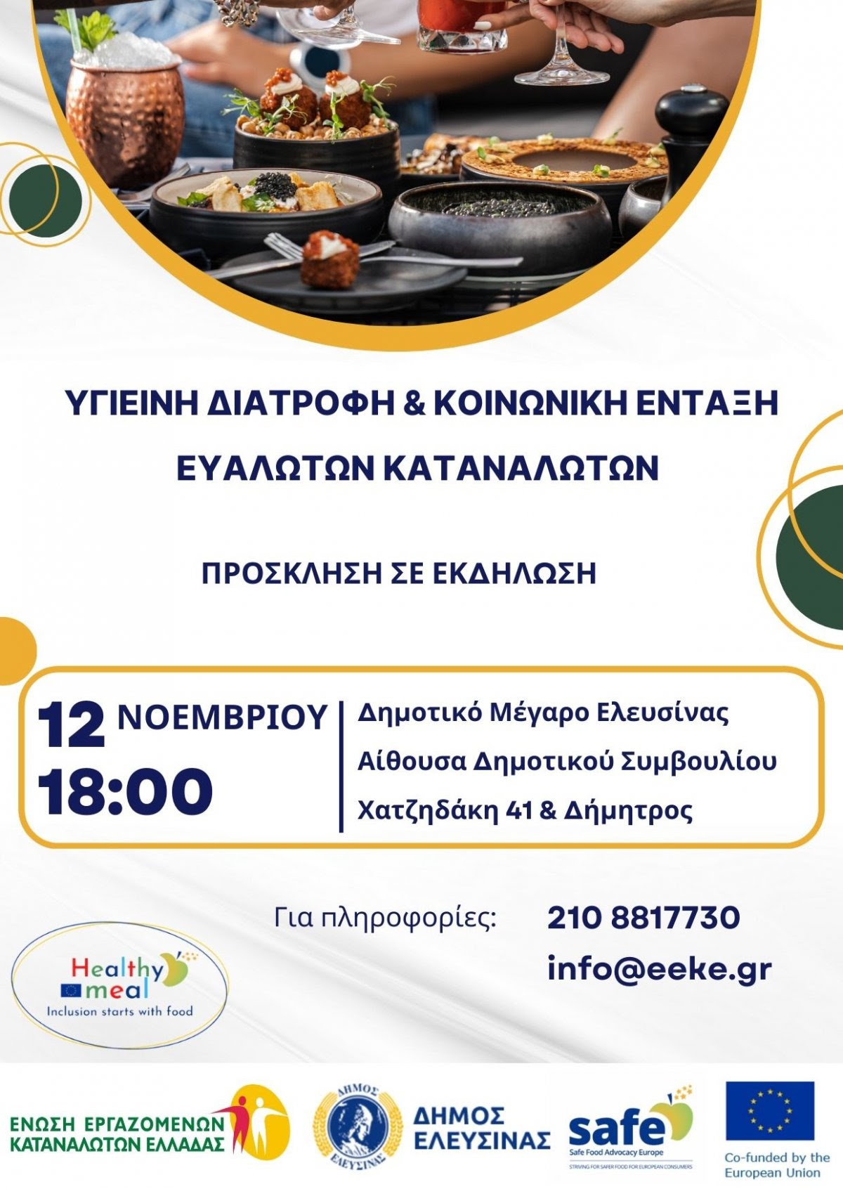 Η Ένωση Εργαζομένων Καταναλωτών Ελλάδας και o Δήμος Ελευσίνας, σας καλούν την Τρίτη 12 Νοεμβρίου και ώρα 18.00 σε εκδήλωση με τίτλο Υγιεινή διατροφή & κοινωνική ένταξη ευάλωτων καταναλωτών.