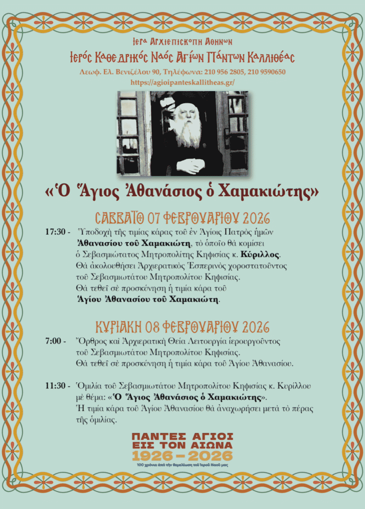 Το Σάββατο 7 Φεβρουαρίου 2026, η τοπική εκκλησιαστική κοινότητα της Κηφισιάς θα έχει την ευκαιρία να προσκυνήσει την Τιμία Κάρα του Αγίου Αθανασίου του Χαμακιώτη, σε μια εκδήλωση με ιδιαίτερο θρησκευτικό και πνευματικό χαρακτήρα. Η άφιξη της τιμίας κάρας θα πραγματοποιηθεί στις 17:30, με τη συνοδεία του Σεβασμιωτάτου Μητροπολίτη Κηφισιάς κ. Κυρίλλου, και θα ακολουθήσει Αρχιερατικός Εσπερινός, όπου ο Μητροπολίτης θα χοροστατήσει, ενώ οι πιστοί θα έχουν την ευκαιρία να προσκυνήσουν το ιερό κειμήλιο.