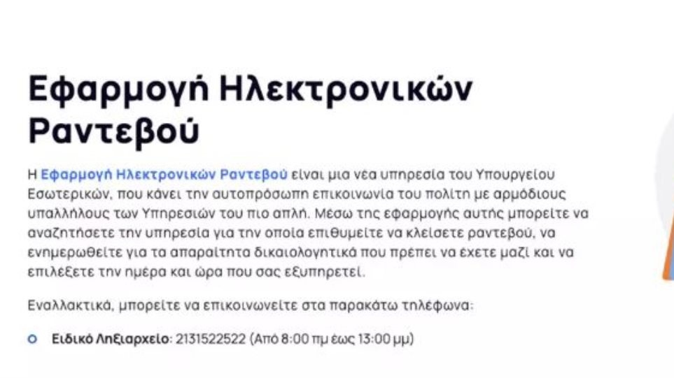 Η πρωτοποριακή αυτή εφαρμογή που φιλοξενείται στην ηλεκτρονική διεύθυνση https://rantevou.ypes.gr κάνει την αυτοπρόσωπη επικοινωνία του πολίτη με τους αρμόδιους υπαλλήλους των υπηρεσιών του υπουργείου Εσωτερικών πιο απλή. Συγκεκριμένα, ο πολίτης μπορεί να αναζητήσει την Υπηρεσία για την οποία επιθυμεί να κλείσει ραντεβού, να ενημερωθεί για τα απαραίτητα δικαιολογητικά που πρέπει να έχει μαζί του και να επιλέξει την ημέρα και ώρα που τον εξυπηρετεί. Επίσης, μπορεί να ακυρώσει ή να μεταθέσει το ραντεβού του σε προσφορότερο χρόνο.