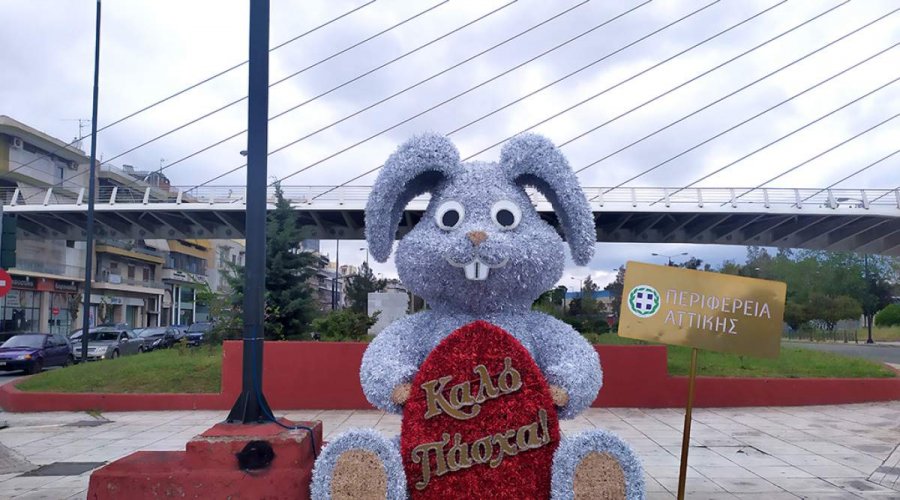 «επιδαπέδιων διακοσμητικών παραστάσεων με τρισδιάστα λαγουδάκια, αυγά και κοτοπουλάκια» και με φωτεινές επιγραφές με την υπογραφή της Περιφέρειας Αττικής.